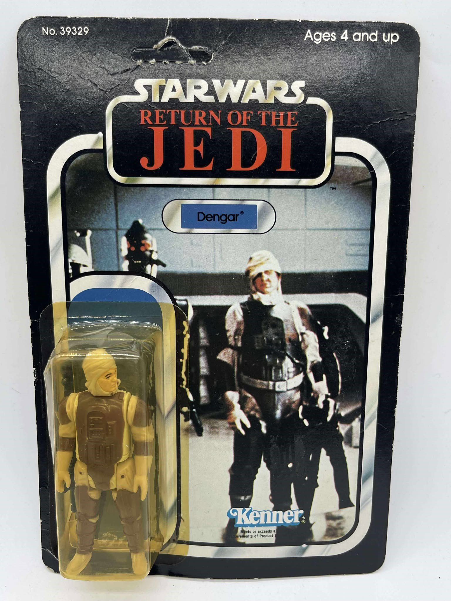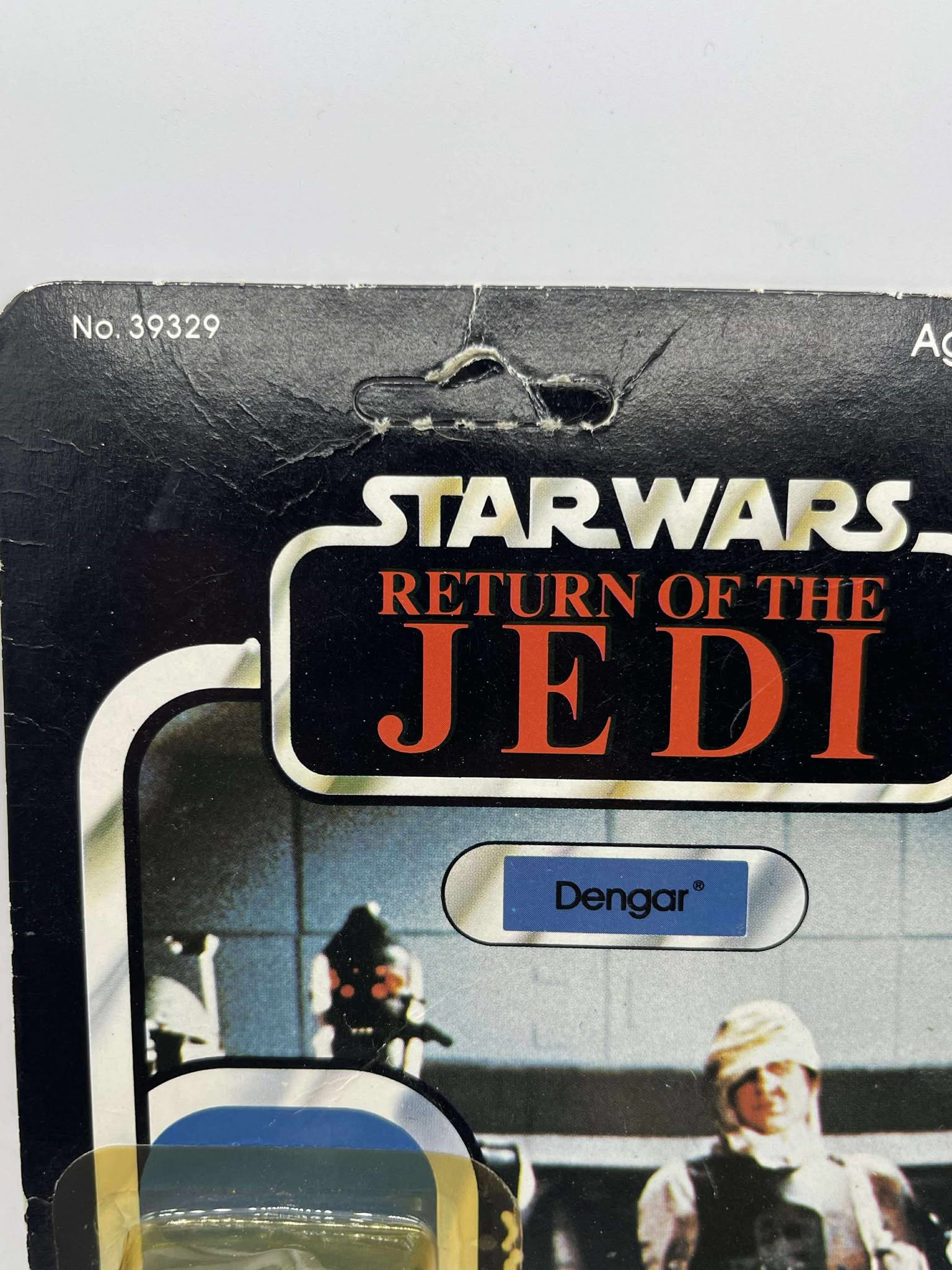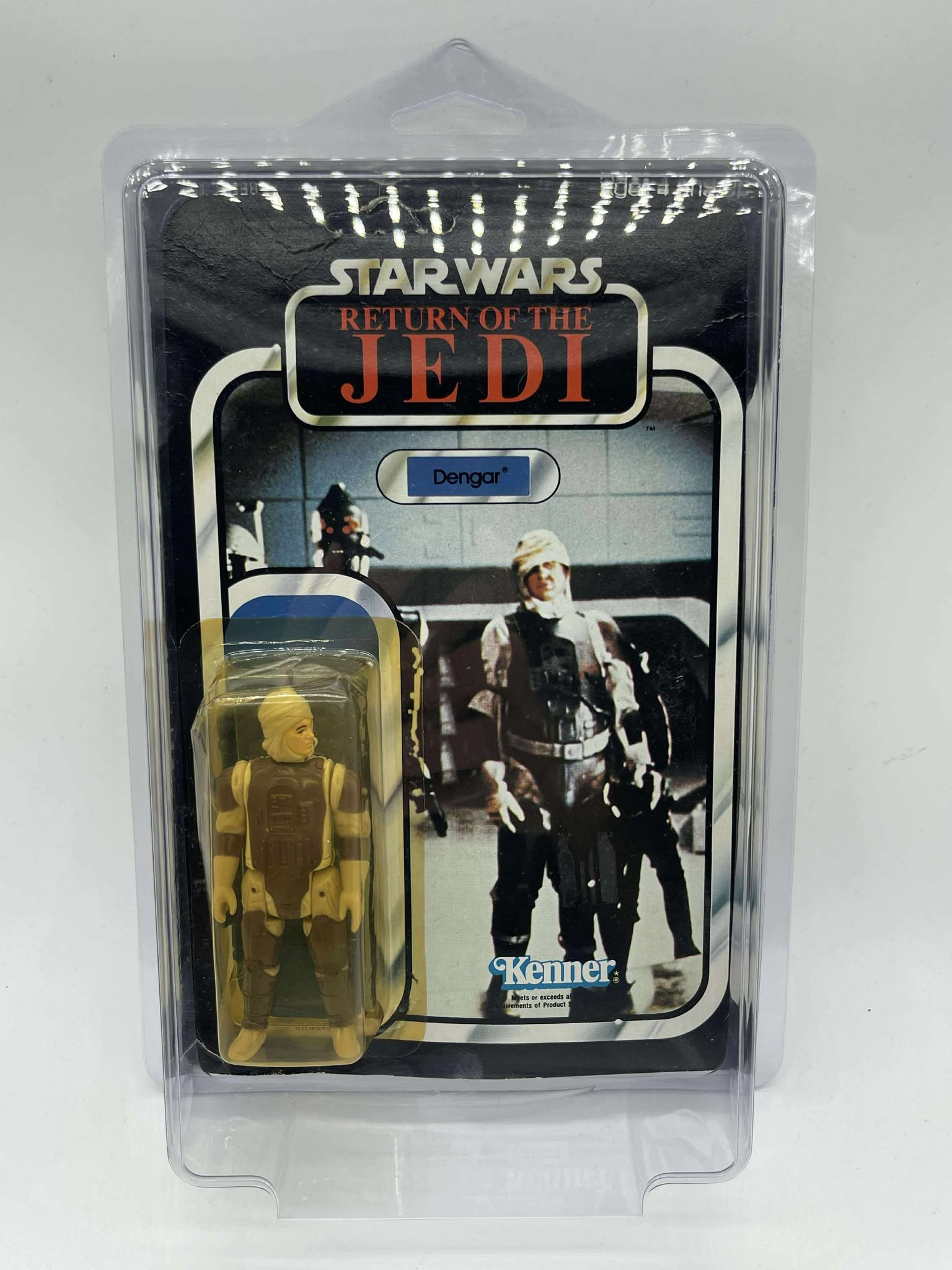 1983 - Kenner - ROTJ Dengar Mint On Card - 77 Back Action Figure w/ Star Case. The bubble has a dent on top and side. Condition: Fine Value Code: C8 ($25-$100)