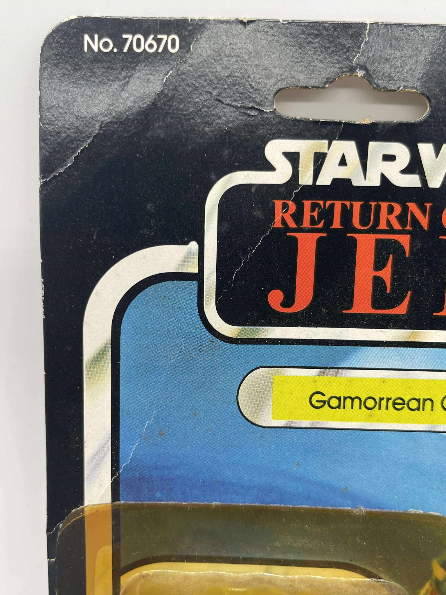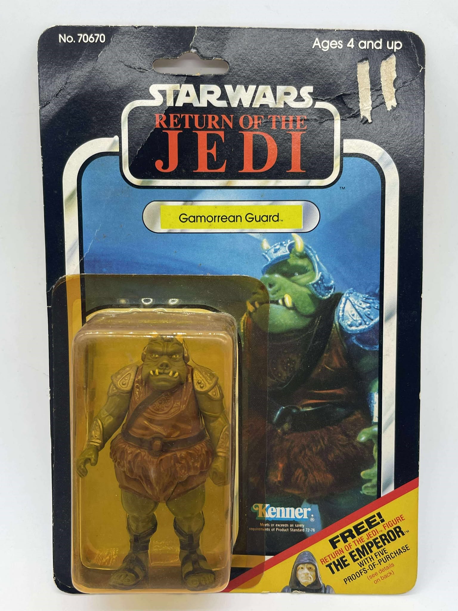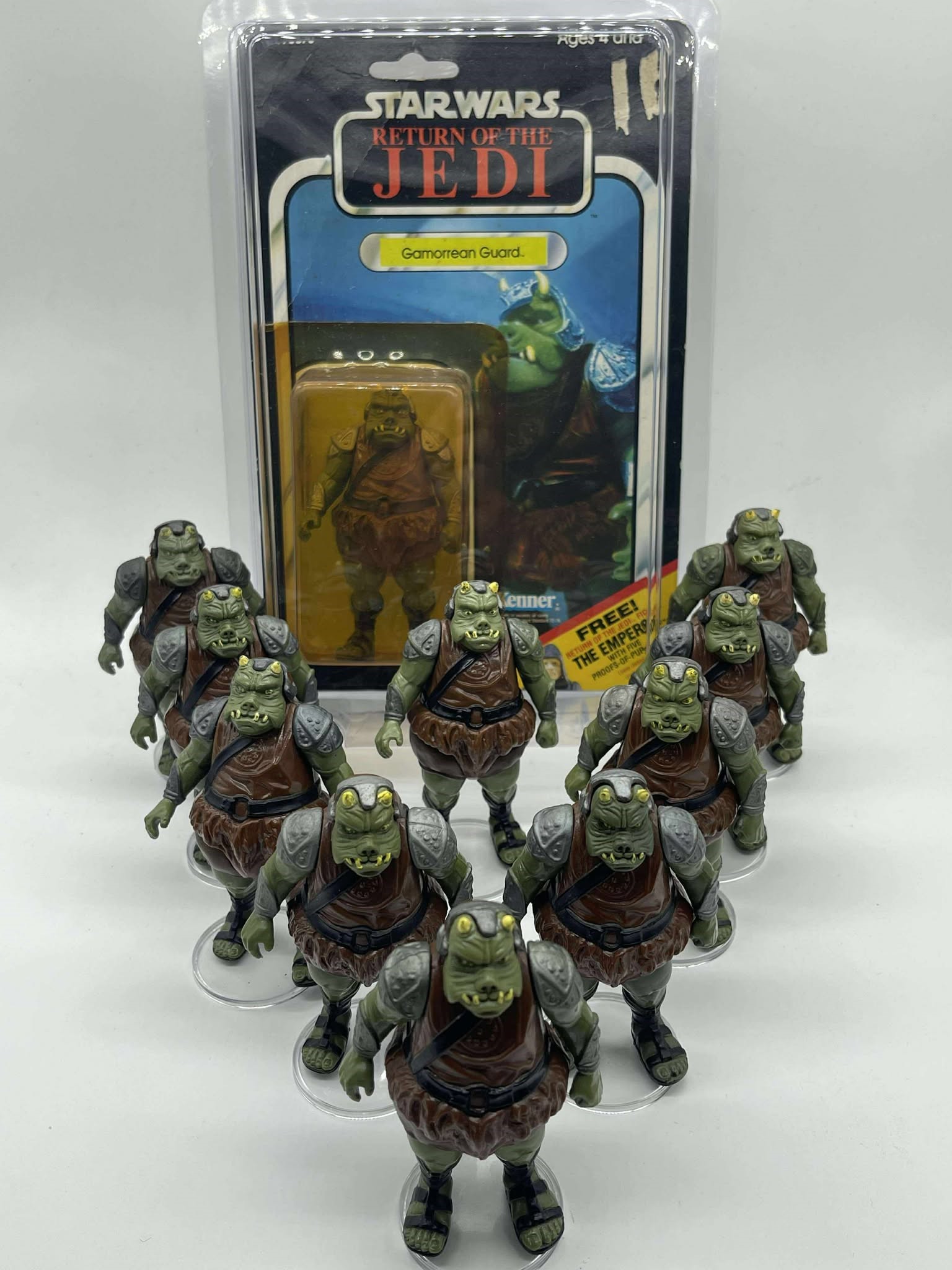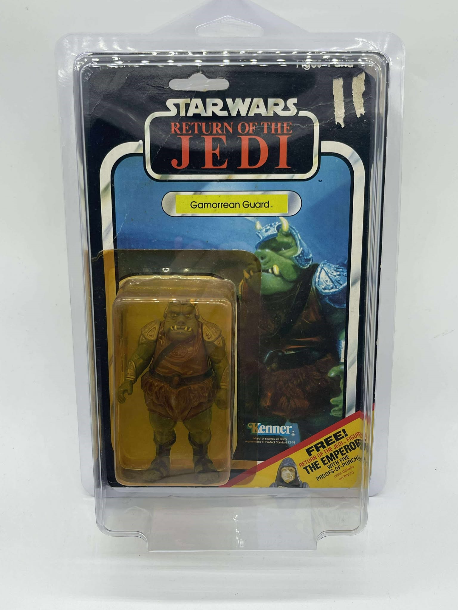 1983 - Kenner - ROTJ Gamorrean Guard Mint On Card 65 Back w/ Emperor Offer & Star Case. This lot also comes with 10 loose Gamorrean Guards (NO WEAPONS). The cardback has some creases on the top left & a litho tear on the top right.