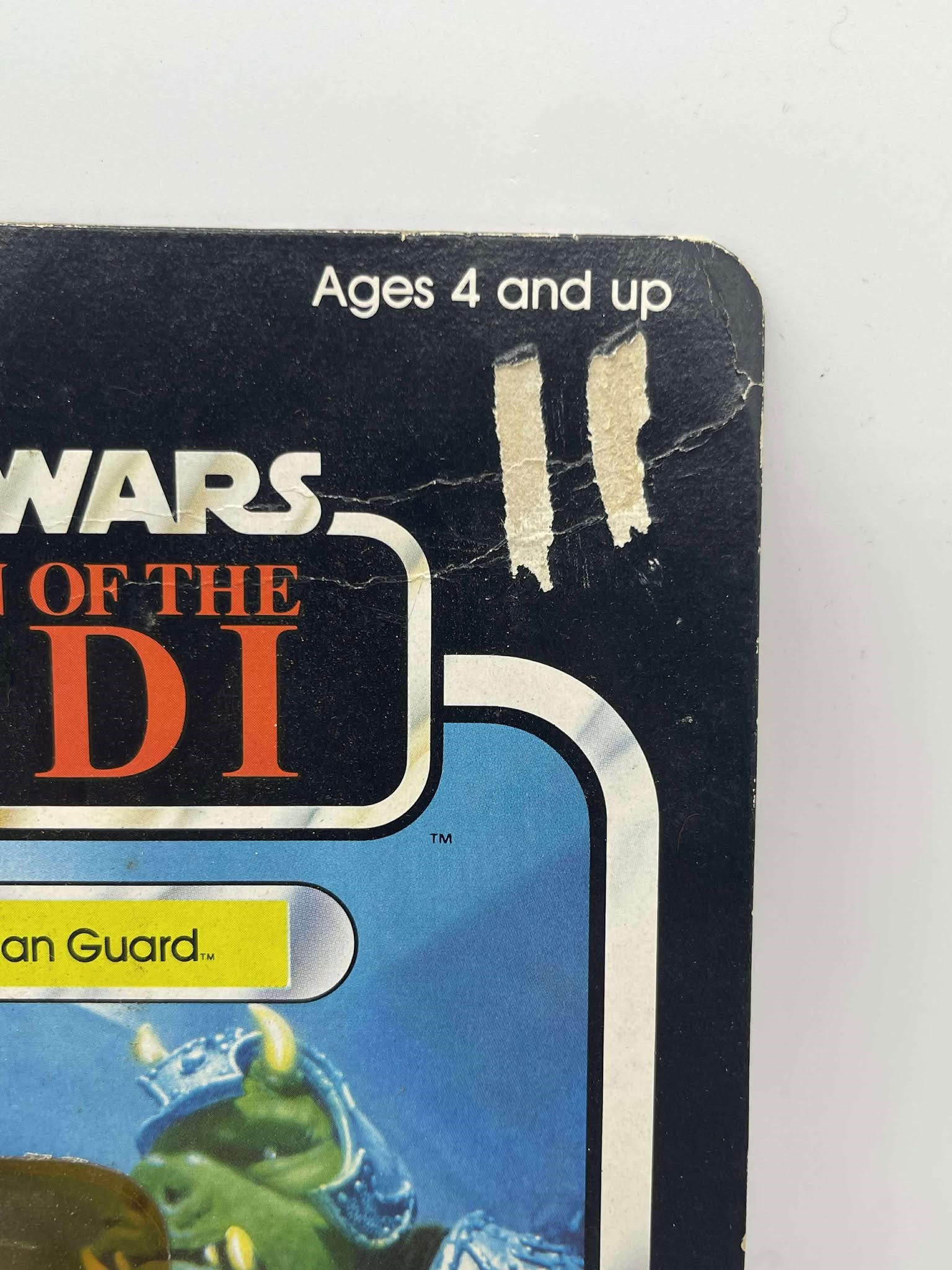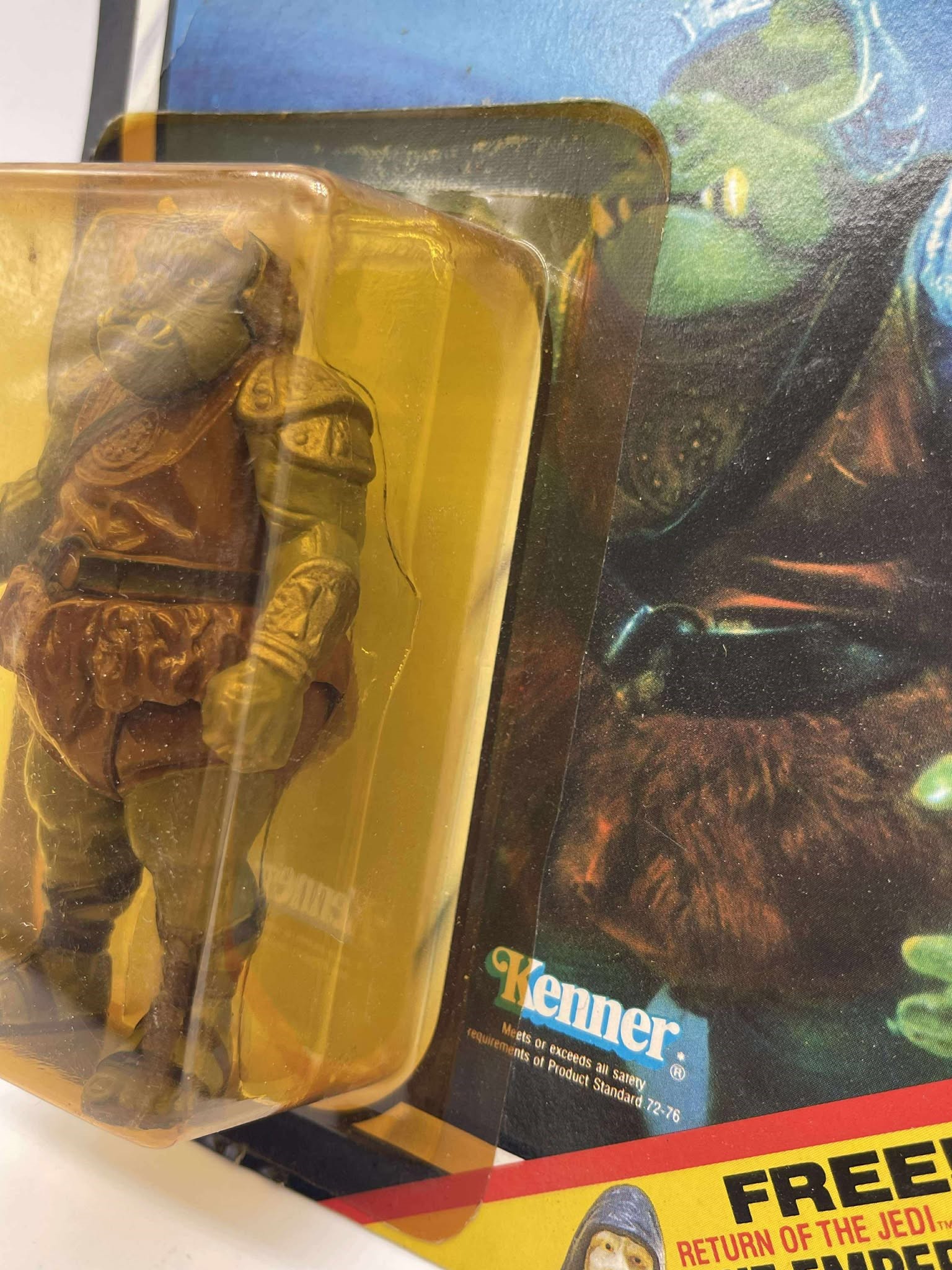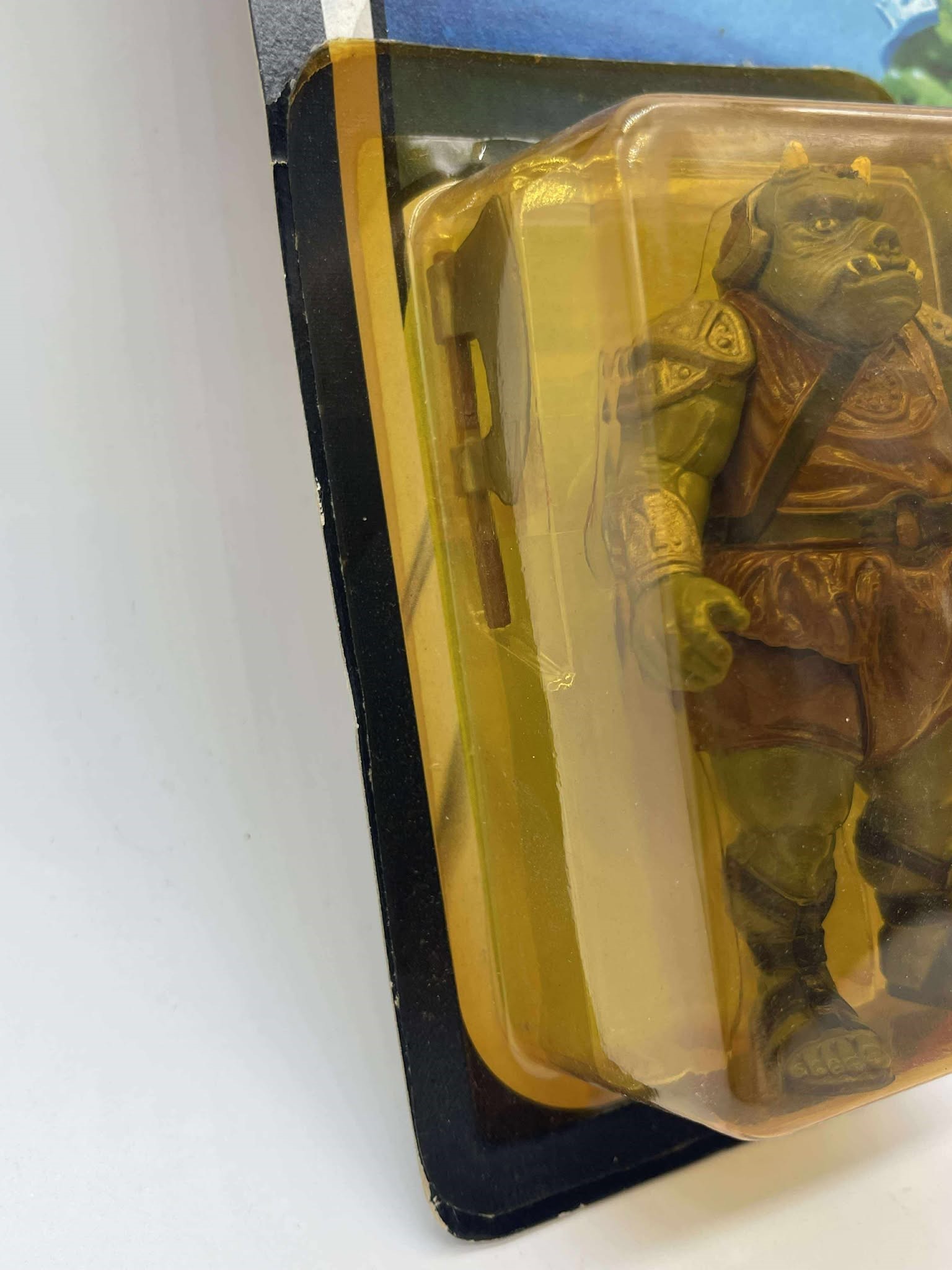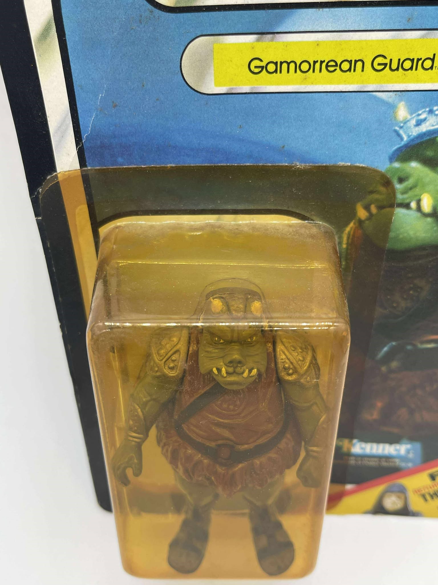 1983 - Kenner - ROTJ Gamorrean Guard Mint On Card 65 Back w/ Emperor Offer & Star Case. This lot also comes with 10 loose Gamorrean Guards (NO WEAPONS). The cardback has some creases on the top left & a litho tear on the top right.
