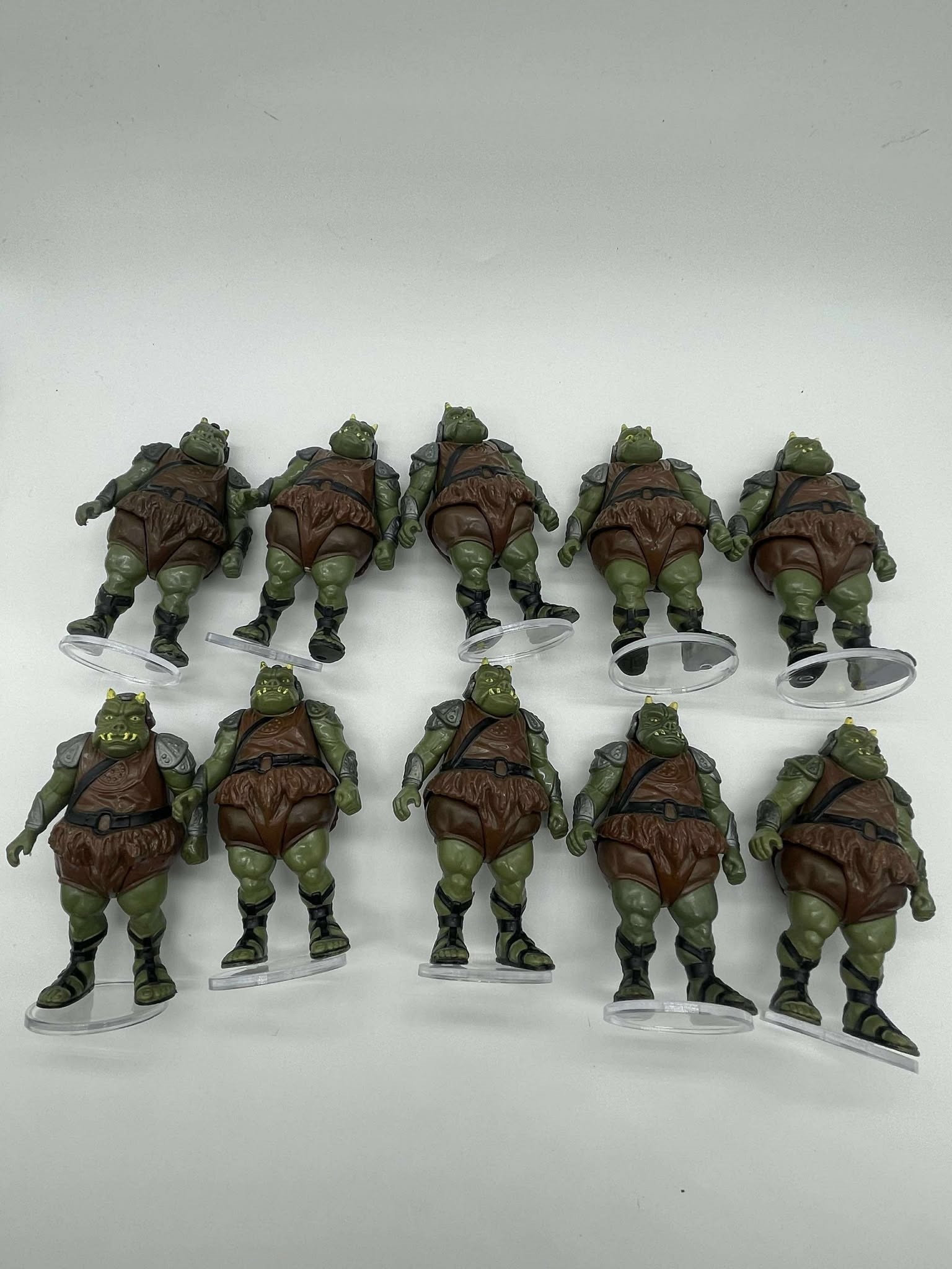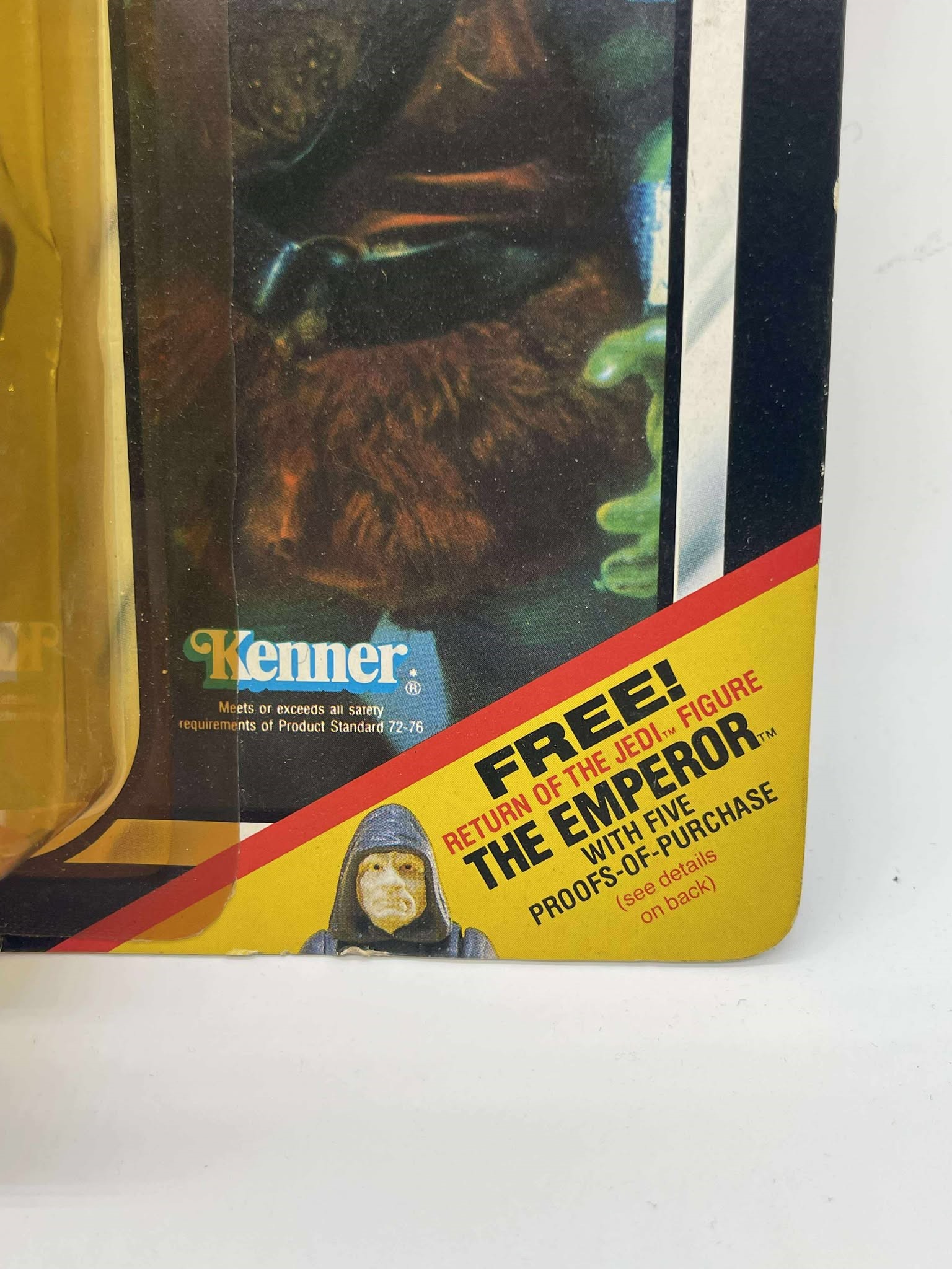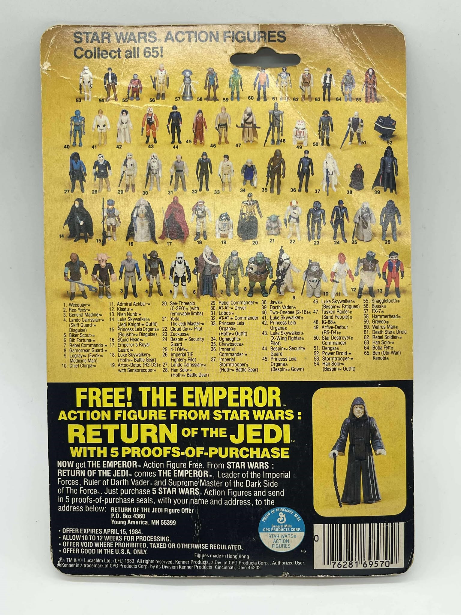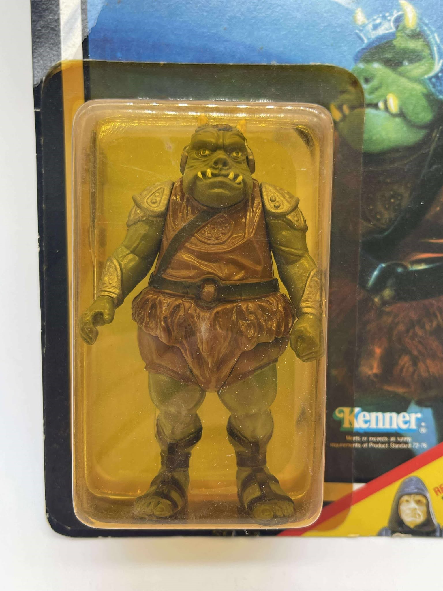 1983 - Kenner - ROTJ Gamorrean Guard Mint On Card 65 Back w/ Emperor Offer & Star Case. This lot also comes with 10 loose Gamorrean Guards (NO WEAPONS). The cardback has some creases on the top left & a litho tear on the top right.