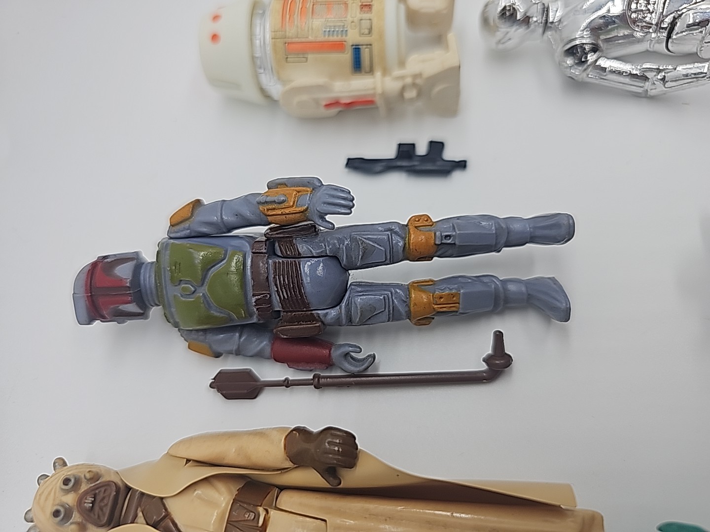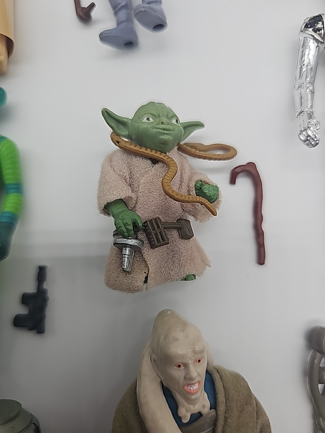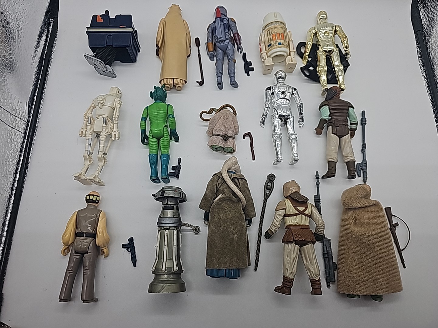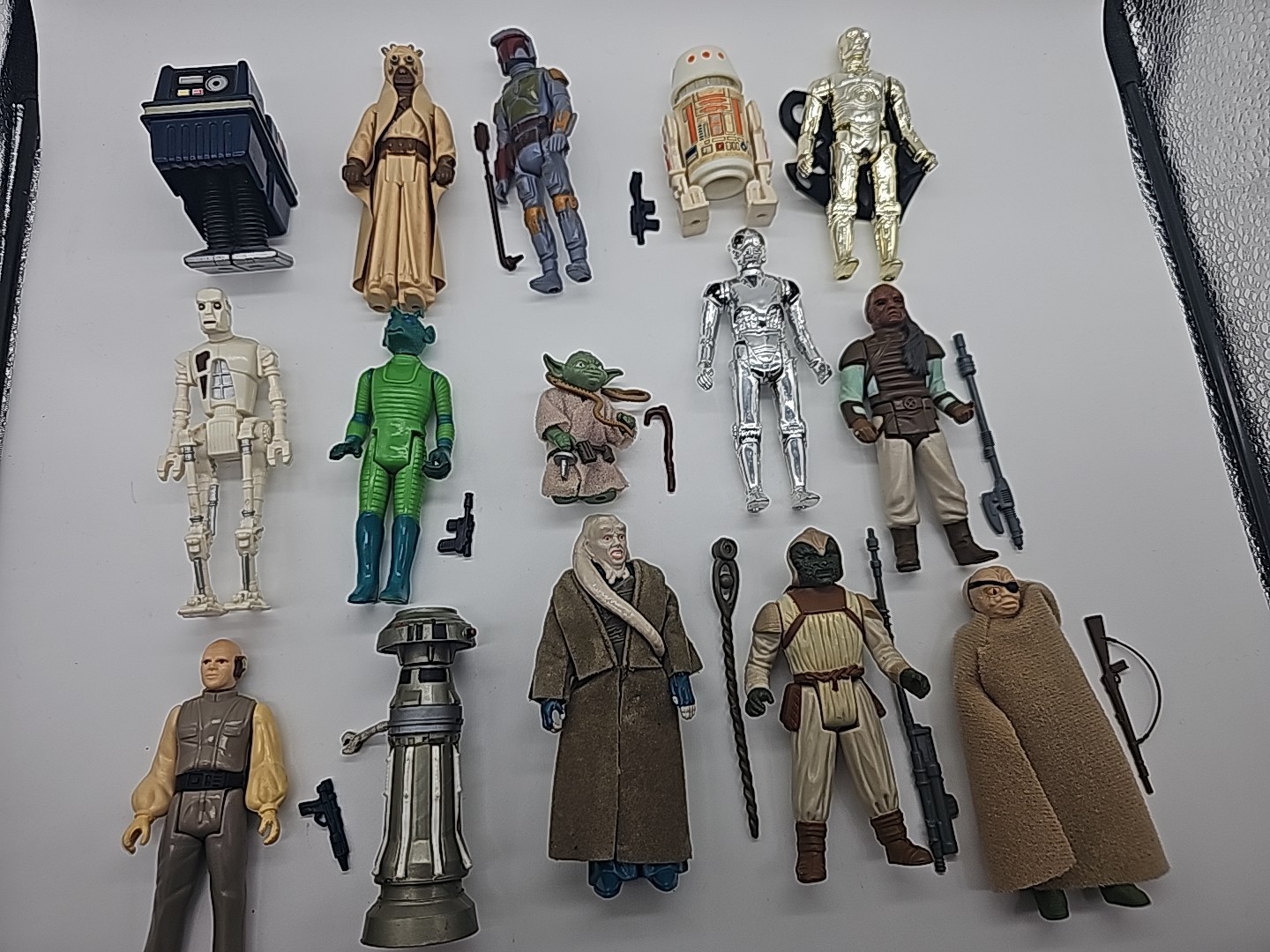 1977-1986 Lot of 15 Vintage Star Wars Complete: Weequay, Power Droid, Tuskin Raider, Boba Fett (HK), R5-D4, Bib Fortuna, 8D8, Yoda (Brown Snake),C-3PO (Removable Limbs), Greedo, Pruneface, Lobot, Klaatu Skiff, FX-7, Death Star Droid. Condition: Flawless - VF Valuation code: C6 $200-$400