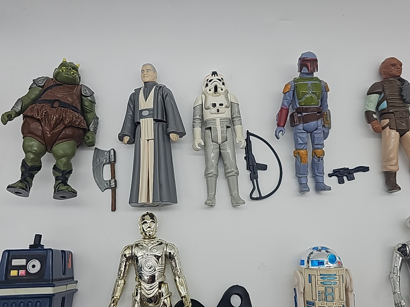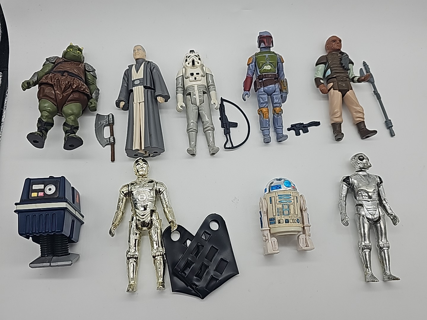 1977-1986 Lot of 9 Complete Vintage Star Wars Complete: Gamorrean Guard, Anakin, AT-AT Driver Boba Fett (really nice), Weequay, Power Droid, C-3PO (removable limbs), R2-D2 (solid dome), Death Star Droid. Condition: Flawless - VG Valuation code: C6 $200-$400