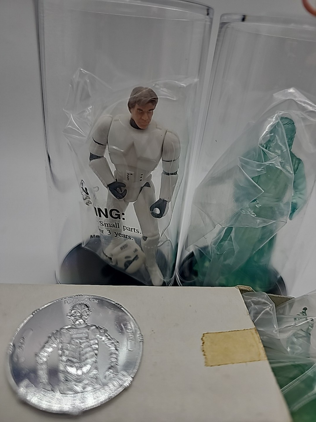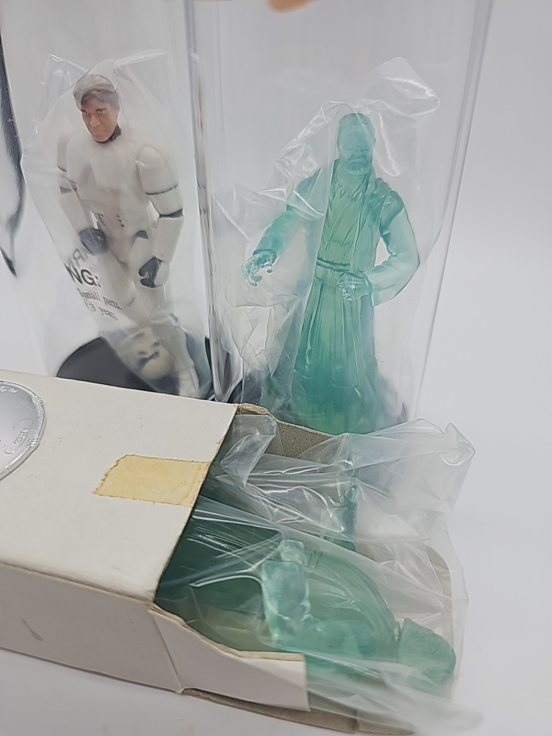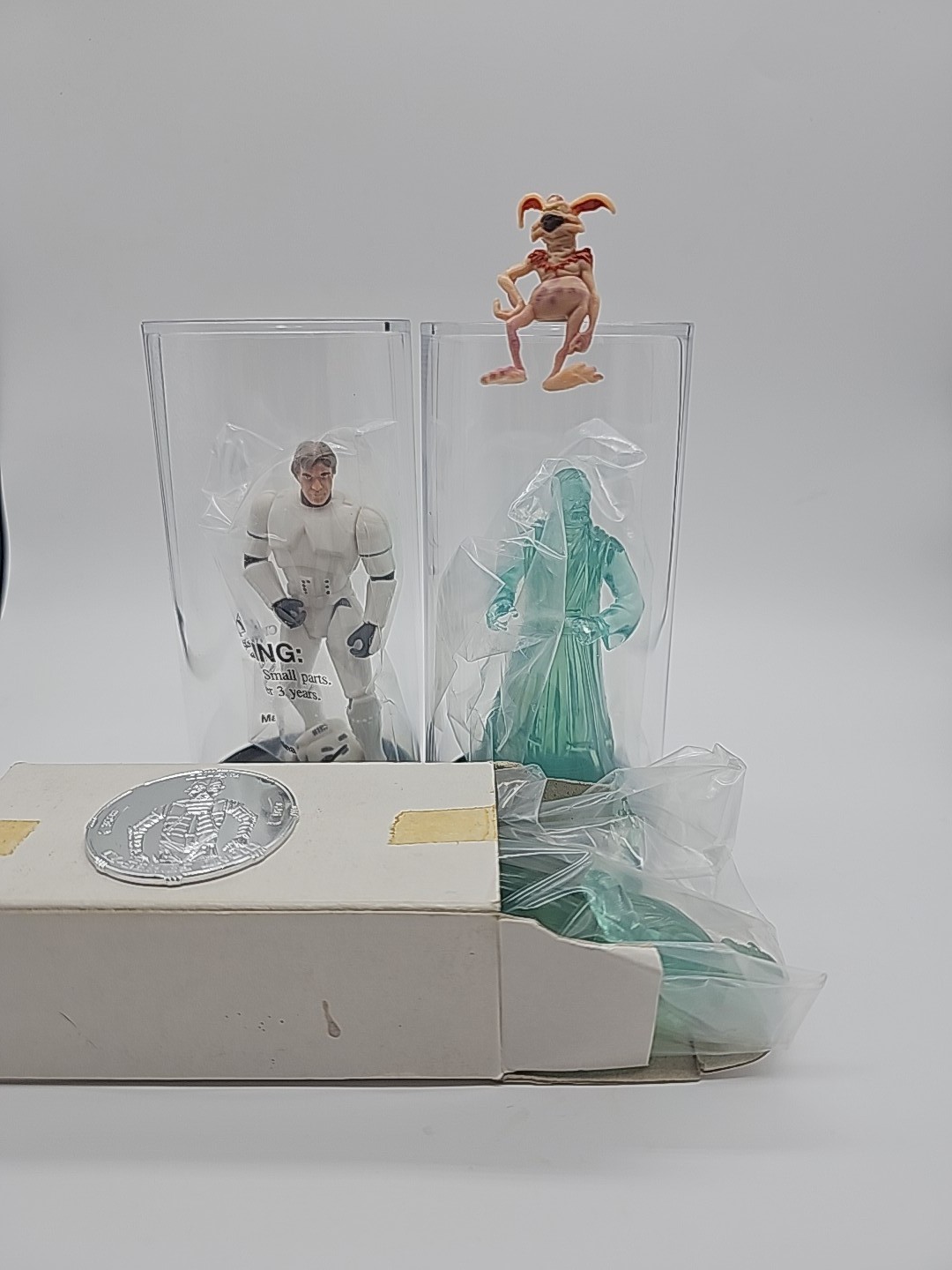 1997 Modern Lot of 3 Sealed Baggie Figures; Han Solo Stormtrooper (Kellogg's), Force Ghost Obi-Wan x2 (Lay's) Extras: small Salicious Crumb + EZ-4 Coin Condition: EXC Valuation code: C8 $25 - $100