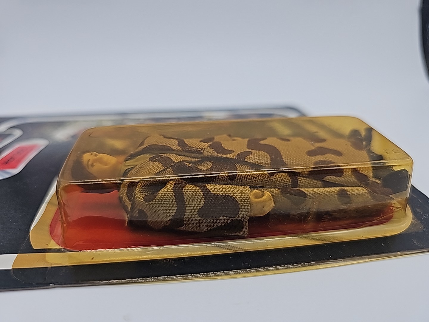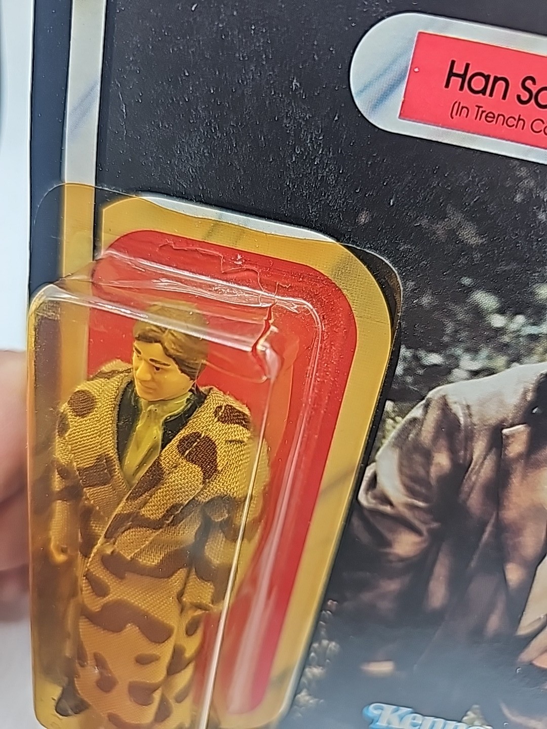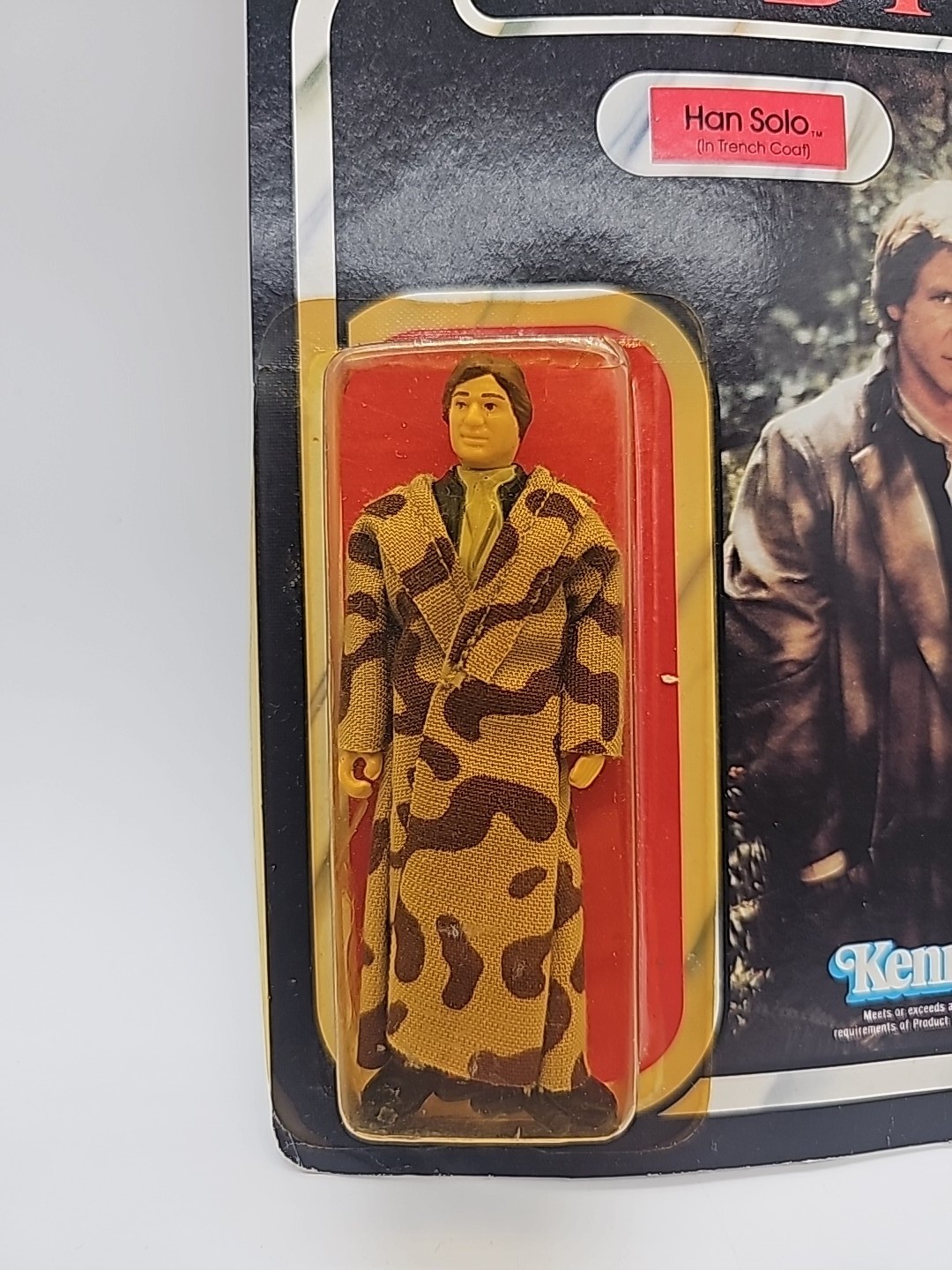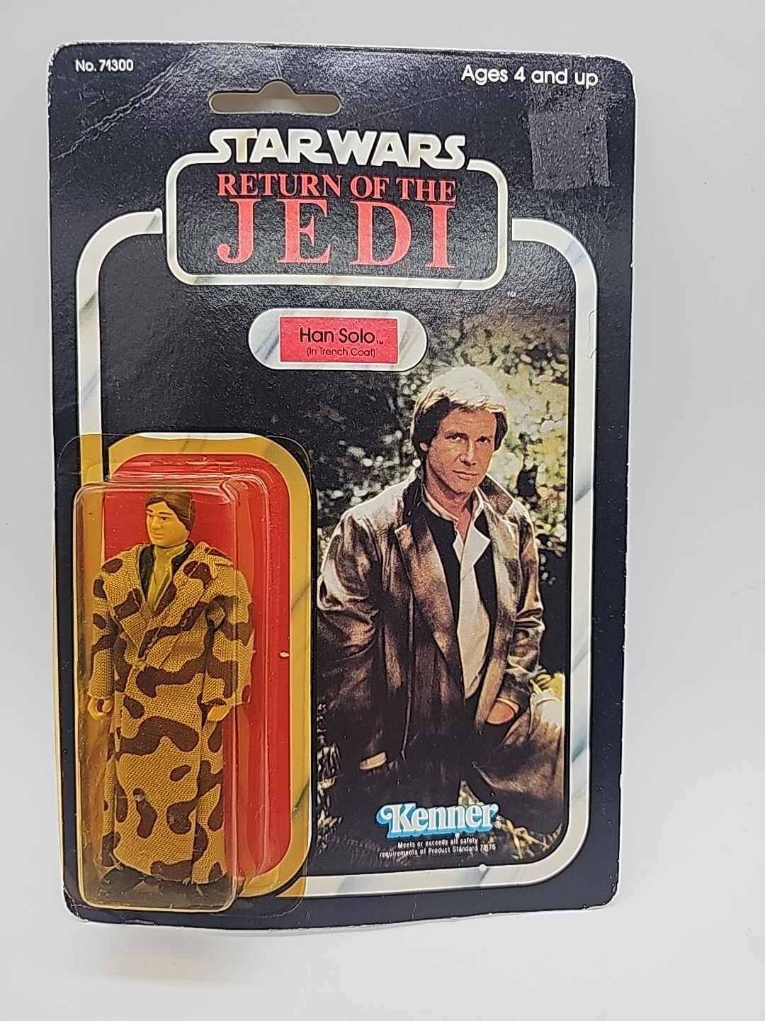 1983 - Kenner - ROTJ Han Solo Trenchcoat (camo lapels) Mint On Card - 77 Back Action Figure w/ Star Case. The card has some price tag residue on top right front. Condition: EXC Valuation code: C7 $100-$200