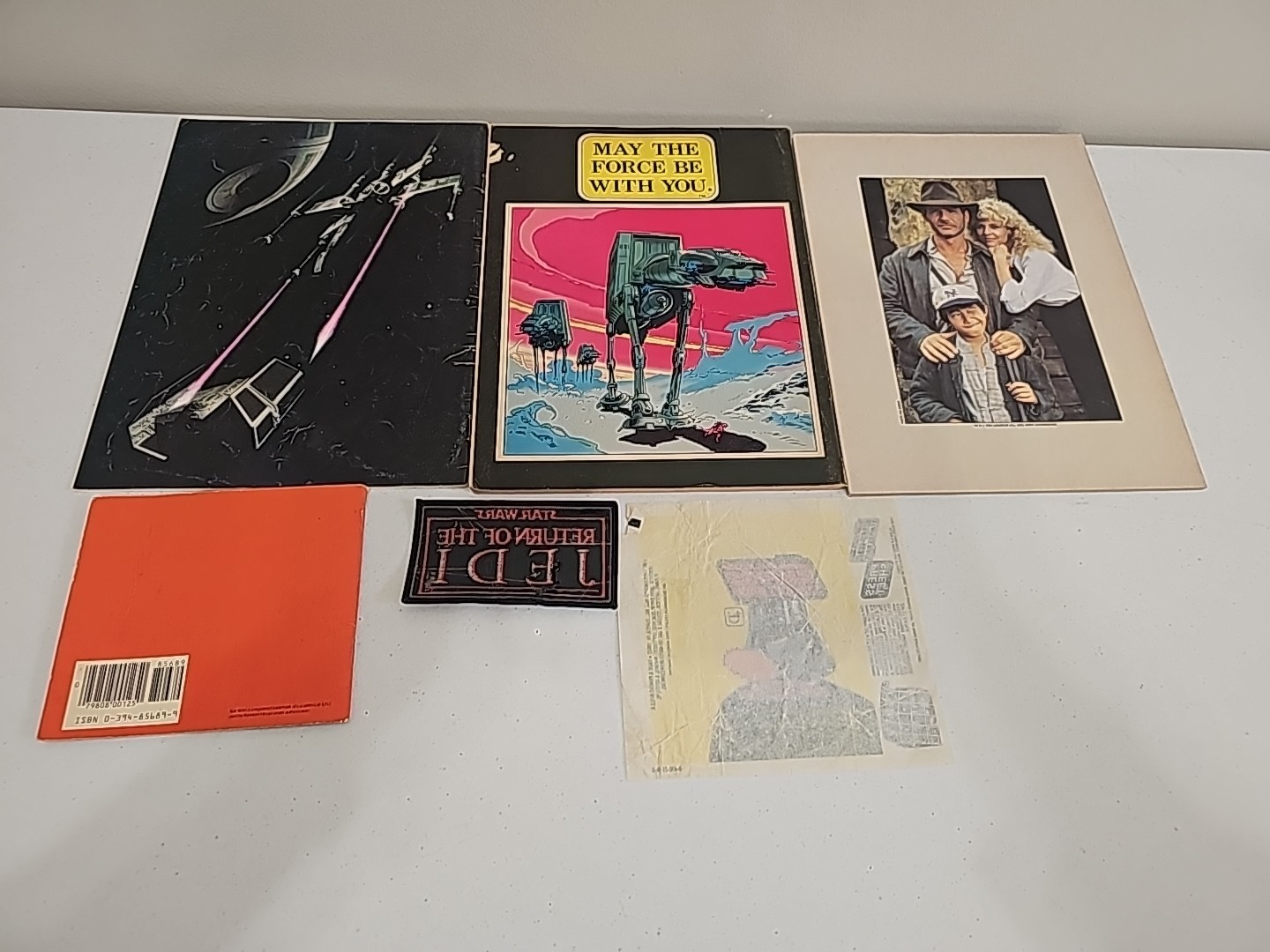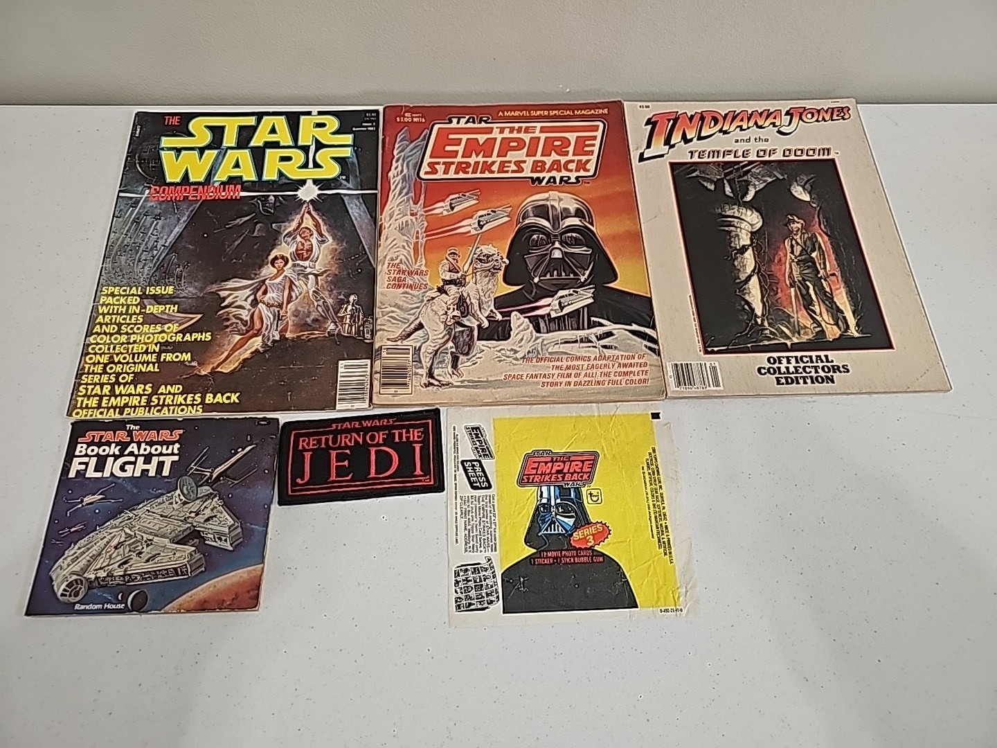 Vintage Star Wars Magazine lot; Star Wars Compendium, ESB Comic Adaptation, Indiana Jones and the Temple of Doom Official Collectors Edition, SW Book of Flight, ROTJ Patch, Empty ESB Topps Waxpack Condition: VG Valuation code: C8 $25-$100