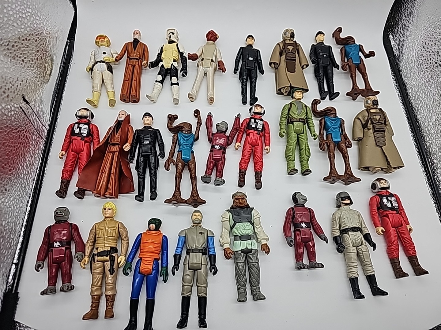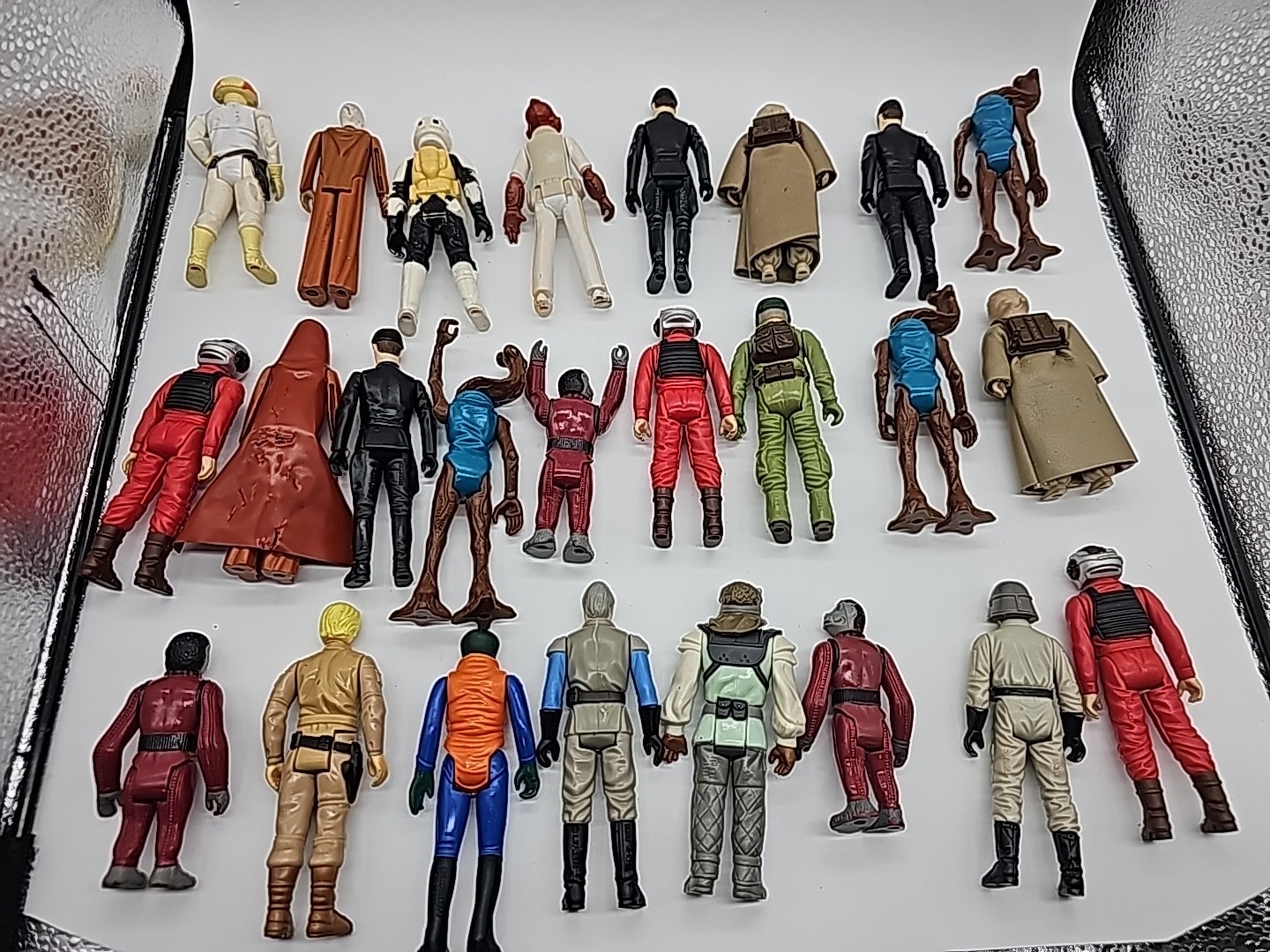 1977-1986 Lot of 25 Incomplete Vintage Star Wars Figures Cloud Car Pilot, Obi-Wan Kenobi x2, Biker Scout, Admiral Ackbar, Imperial Commander x3, 4-LOM x2, Hammerhead x3, B-Wing Pilot x3, Snaggletooth x3, Endor Rebel Soldier, Luke Bespin, Walrus Man, General Madine, Nikto & AT-ST Driver Condition: VG Valuation Code: C7 $100-$200