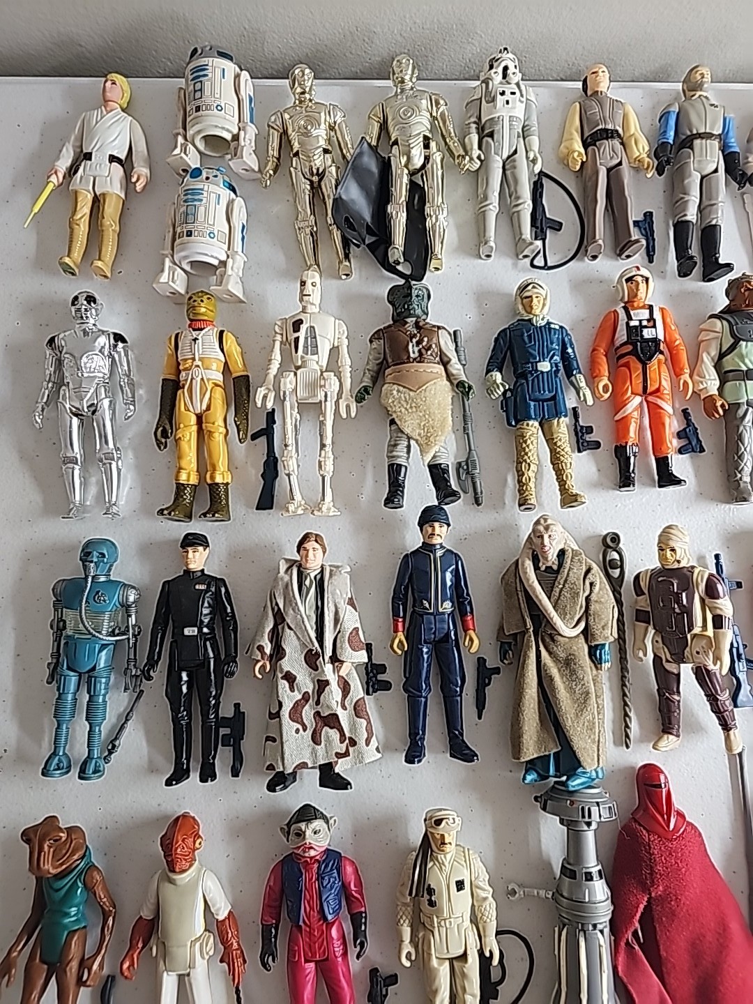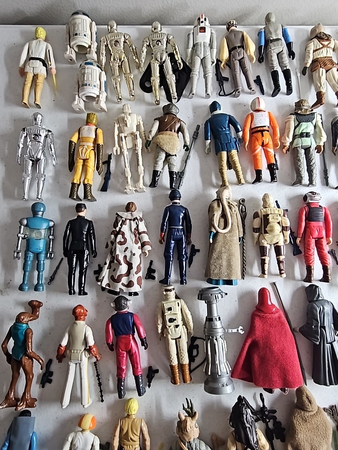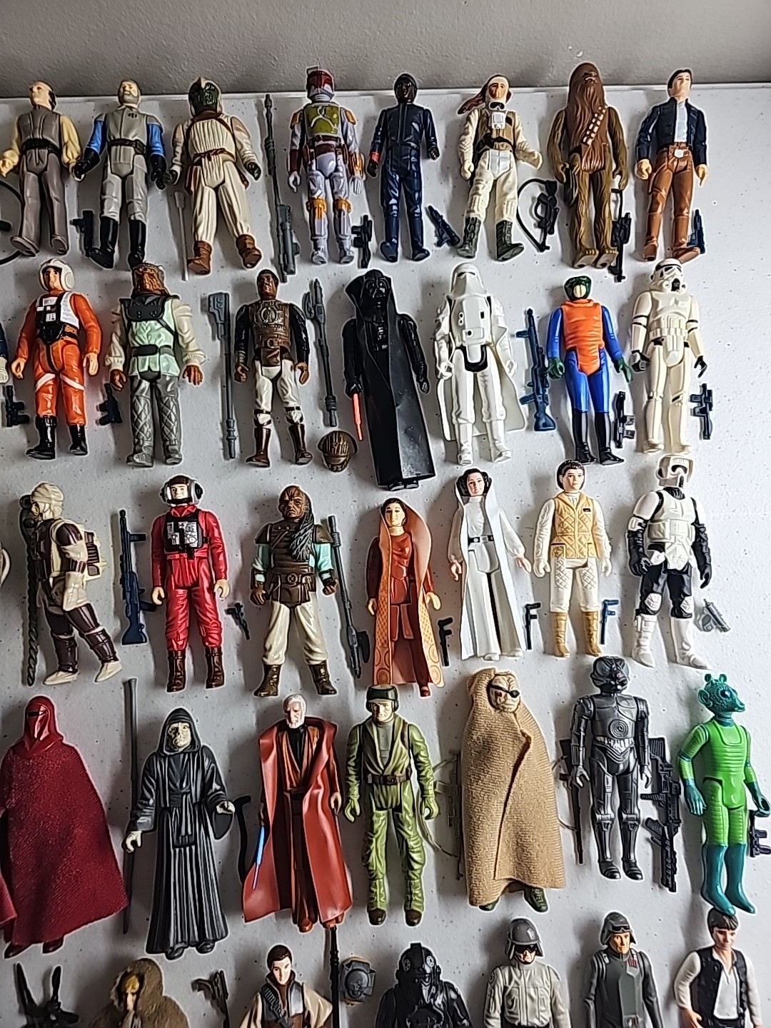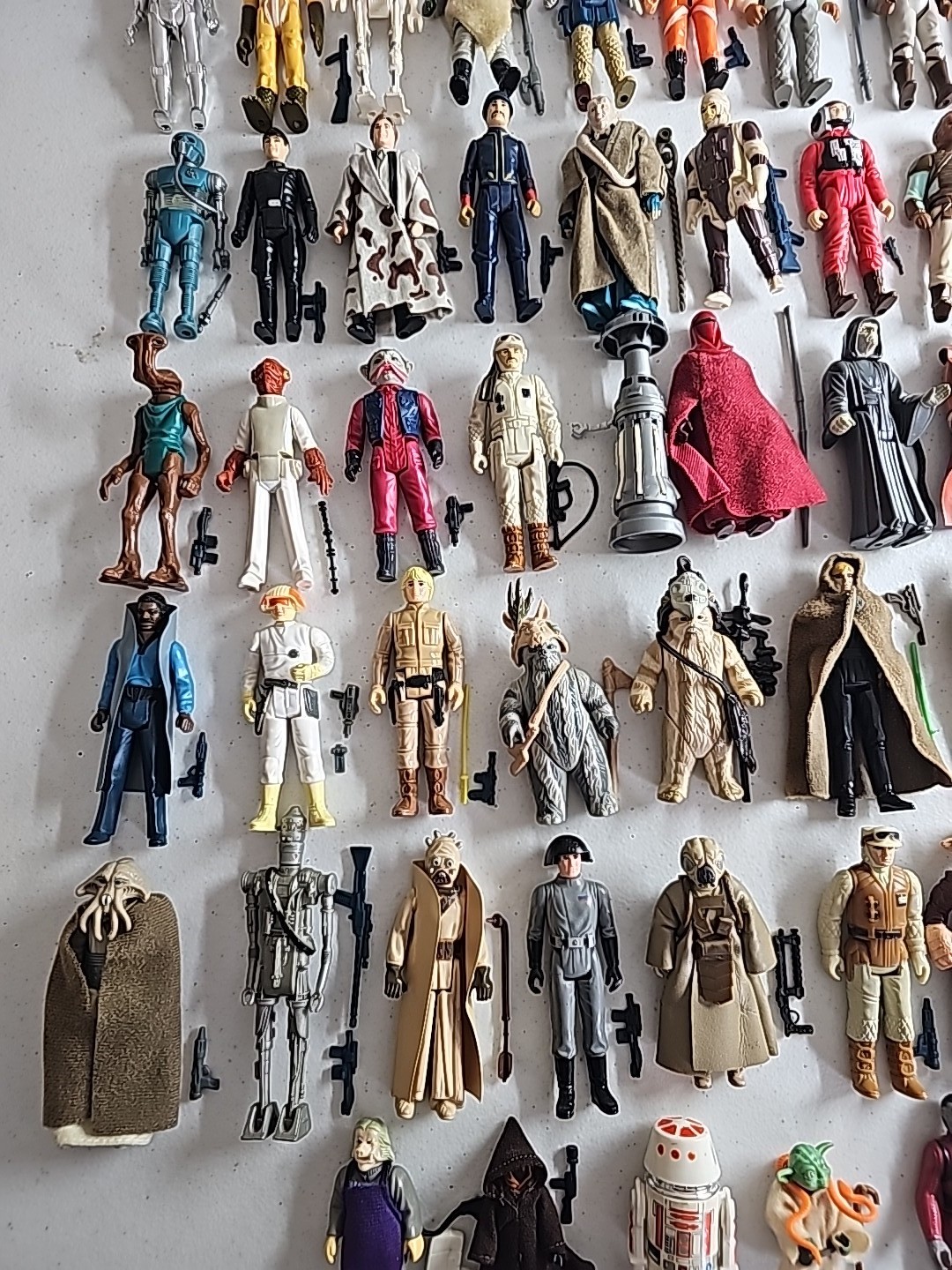 The first 79 vintage Star Wars action figures Complete in Very Nice Condition (Robert Kilpatrick's Personal Complete Set): Luke Skywalker, Princess Leia, Artoo-Detoo (R2-D2), Chewbacca, See-Threepio (C-3PO), Darth Vader, Stormtrooper, Ben (Obi-Wan) Kenobi, Han Solo, Jawa, Sand People, Death Squad Commander, Greedo, Hammerhead, Snaggletooth, Walrus Man, Luke Skywalker: X-wing Pilot, R5-D4, Death Star Droid, Power Droid, Boba Fett, Leia Organa (Bespin Gown), FX-7, Imperial Stormtrooper (Hoth Battle Gear), Rebel Soldier (Hoth Battle Gear), Bossk (Bounty Hunter), IG-88, Luke Skywalker (Bespin Fatigues), Han Solo (Hoth Outfit), Lando Calrissian, Bespin Security Guard, Yoda, Ugnaught, Dengar, Han Solo (Bespin Outfit), Lobot, Leia (Hoth Outfit), Rebel Commander, AT-AT Driver, Imperial Commander, 2-1B, Artoo-Detoo (R2-D2) (with Sensorscope), C-3PO (Removable Limbs), Luke Skywalker (Hoth Battle Gear), AT-AT Commander, (Twin-Pod) Cloud Car Pilot, Bespin Security Guard, 4-LOM, Zuckuss, Imperial Tie Fighter Pilot, Admiral Ackbar, Luke Skywalker (Jedi Knight Outfit), Princess Leia Organa (Boushh Disguise), Gamorrean Guard, Emperor's Royal Guard, Chief Chirpa, Logray (Ewok Medicine Man), Klaatu, Rebel Commando, Weequay, Squid Head, General Madine, Bib Fortuna, Ree-Yees, Biker Scout, Lando Calrissian (Skiff Guard Disguise), Nien Nunb, Nikto, 8D8, Princess Leia Organa (in Combat Poncho), Wicket W. Warrick, The Emperor, B-Wing Pilot, Klaatu (in Skiff Guard Outfit), Han Solo (in Trench Coat), Teebo, Prune Face, AT-ST Driver, Rancor Keeper. Condition: Flawless - VF