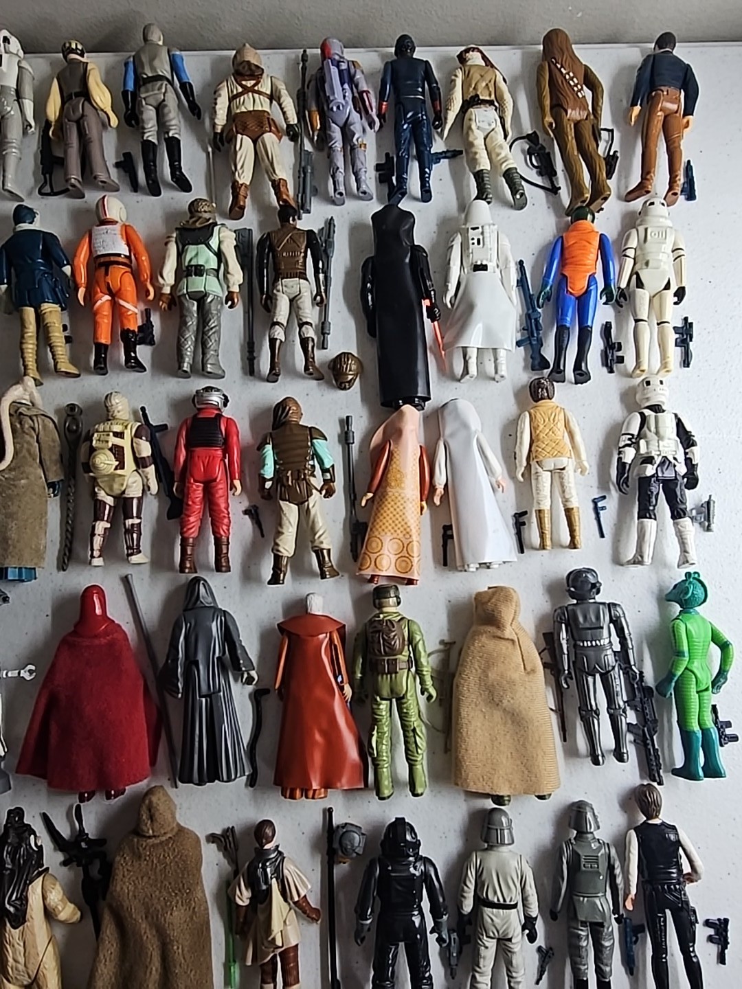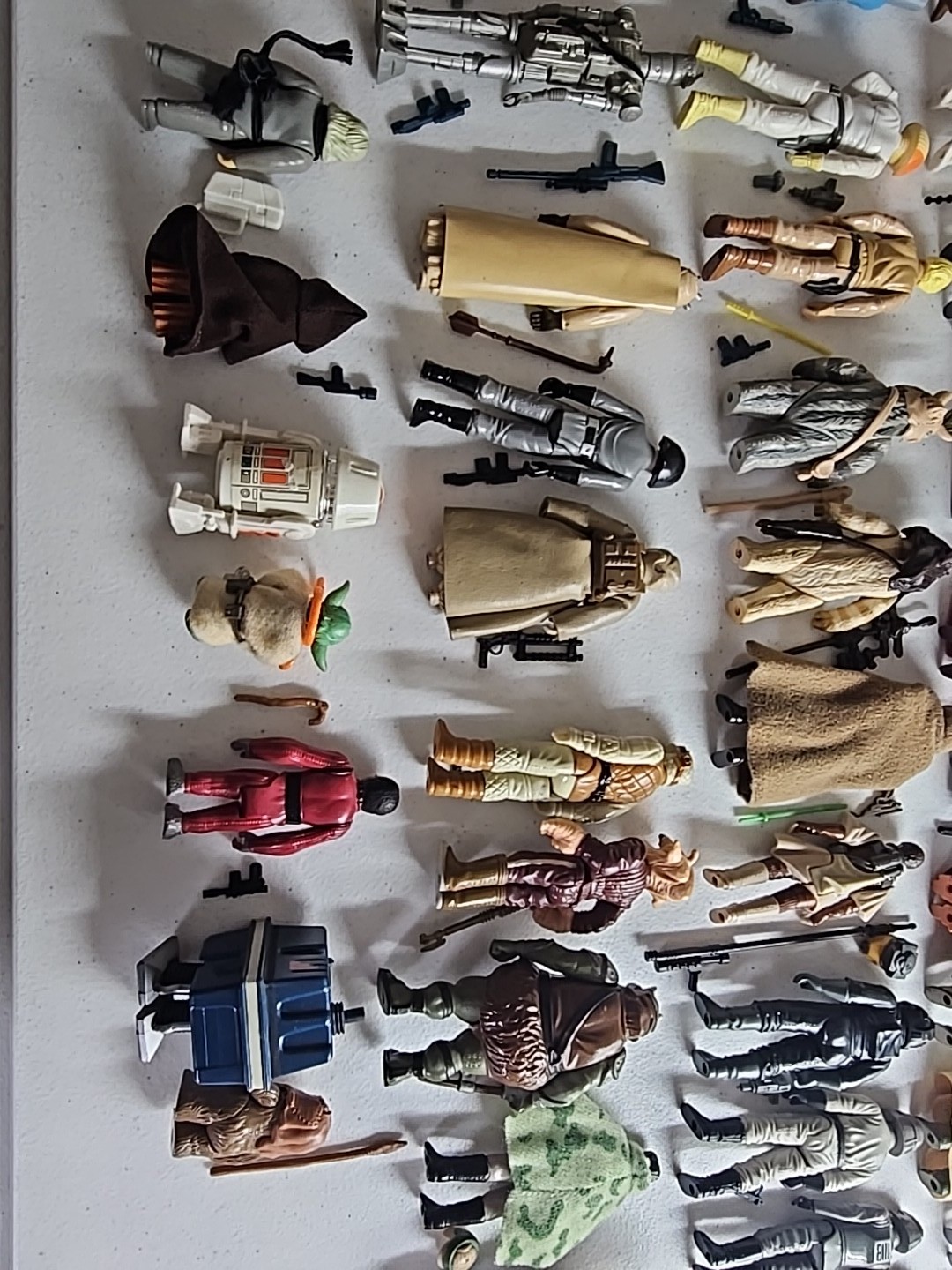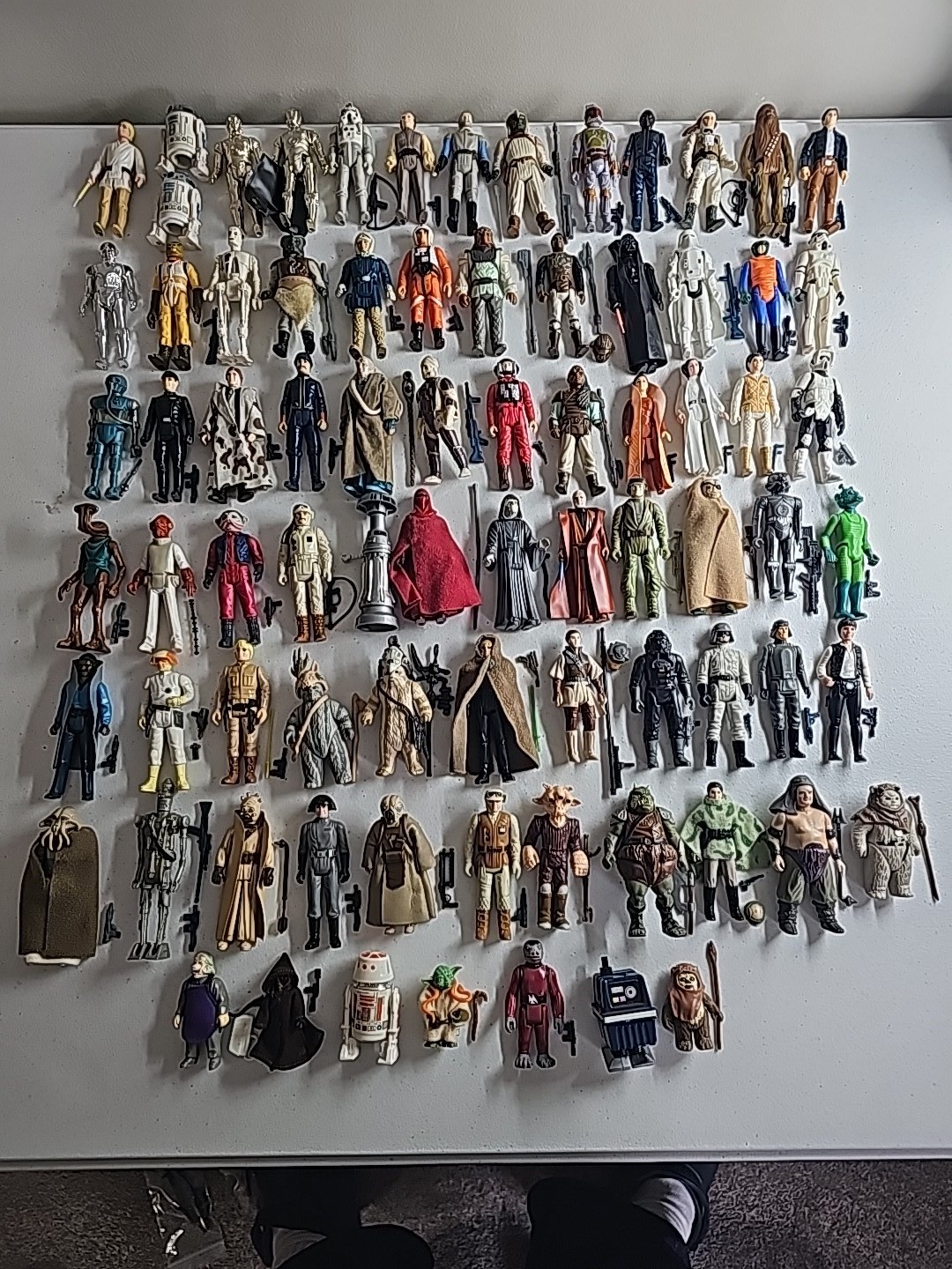 The first 79 vintage Star Wars action figures Complete in Very Nice Condition (Robert Kilpatrick's Personal Complete Set): Luke Skywalker, Princess Leia, Artoo-Detoo (R2-D2), Chewbacca, See-Threepio (C-3PO), Darth Vader, Stormtrooper, Ben (Obi-Wan) Kenobi, Han Solo, Jawa, Sand People, Death Squad Commander, Greedo, Hammerhead, Snaggletooth, Walrus Man, Luke Skywalker: X-wing Pilot, R5-D4, Death Star Droid, Power Droid, Boba Fett, Leia Organa (Bespin Gown), FX-7, Imperial Stormtrooper (Hoth Battle Gear), Rebel Soldier (Hoth Battle Gear), Bossk (Bounty Hunter), IG-88, Luke Skywalker (Bespin Fatigues), Han Solo (Hoth Outfit), Lando Calrissian, Bespin Security Guard, Yoda, Ugnaught, Dengar, Han Solo (Bespin Outfit), Lobot, Leia (Hoth Outfit), Rebel Commander, AT-AT Driver, Imperial Commander, 2-1B, Artoo-Detoo (R2-D2) (with Sensorscope), C-3PO (Removable Limbs), Luke Skywalker (Hoth Battle Gear), AT-AT Commander, (Twin-Pod) Cloud Car Pilot, Bespin Security Guard, 4-LOM, Zuckuss, Imperial Tie Fighter Pilot, Admiral Ackbar, Luke Skywalker (Jedi Knight Outfit), Princess Leia Organa (Boushh Disguise), Gamorrean Guard, Emperor's Royal Guard, Chief Chirpa, Logray (Ewok Medicine Man), Klaatu, Rebel Commando, Weequay, Squid Head, General Madine, Bib Fortuna, Ree-Yees, Biker Scout, Lando Calrissian (Skiff Guard Disguise), Nien Nunb, Nikto, 8D8, Princess Leia Organa (in Combat Poncho), Wicket W. Warrick, The Emperor, B-Wing Pilot, Klaatu (in Skiff Guard Outfit), Han Solo (in Trench Coat), Teebo, Prune Face, AT-ST Driver, Rancor Keeper. Condition: Flawless - VF