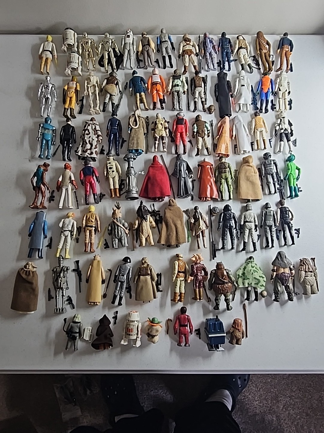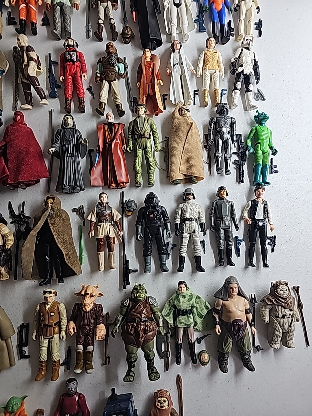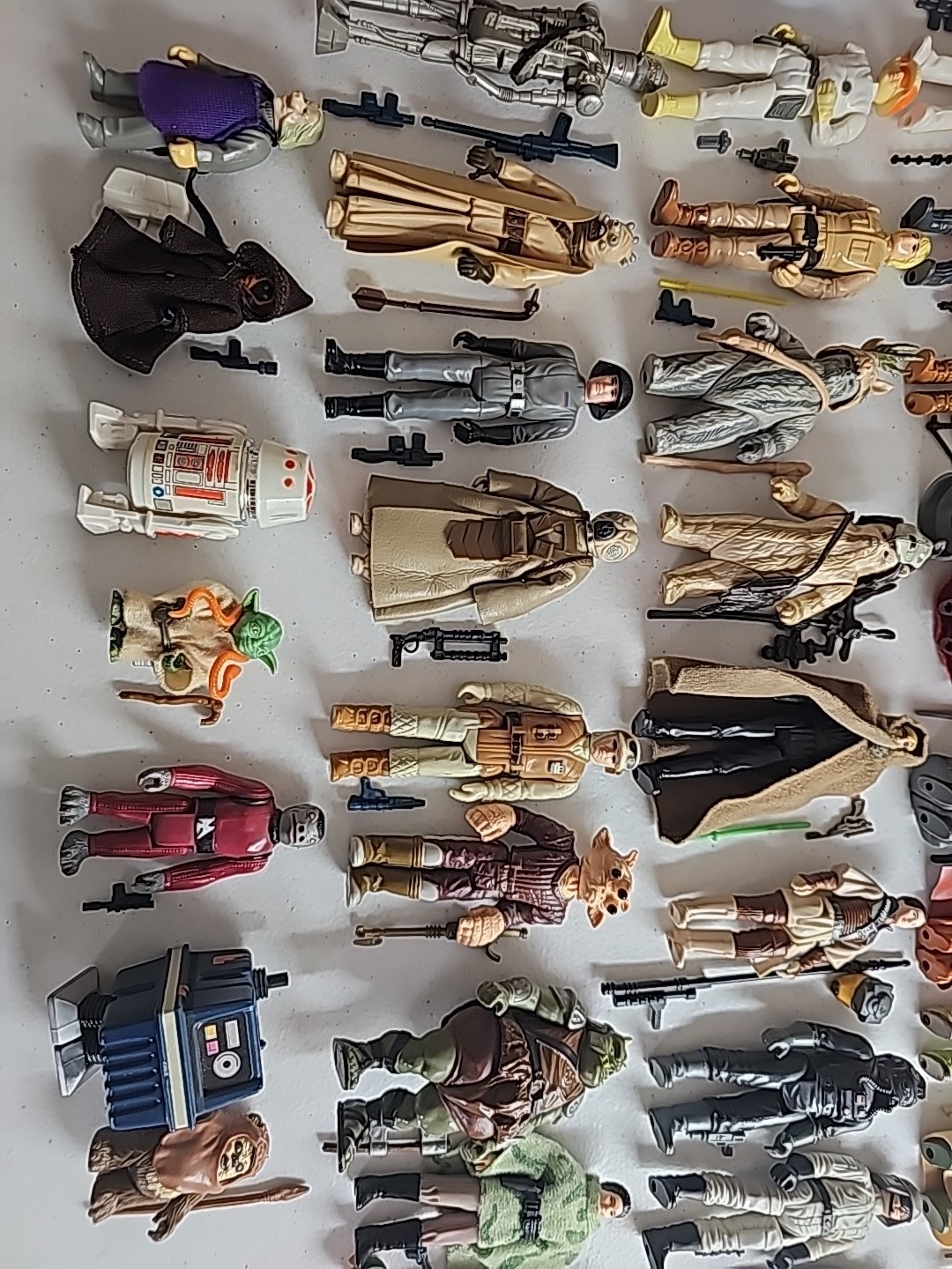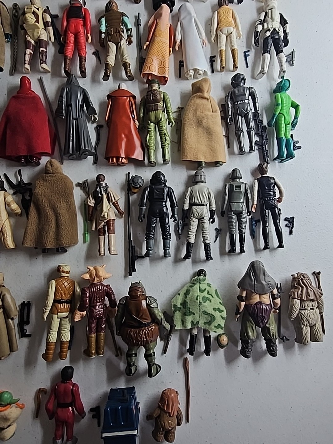 The first 79 vintage Star Wars action figures Complete in Very Nice Condition (Robert Kilpatrick's Personal Complete Set): Luke Skywalker, Princess Leia, Artoo-Detoo (R2-D2), Chewbacca, See-Threepio (C-3PO), Darth Vader, Stormtrooper, Ben (Obi-Wan) Kenobi, Han Solo, Jawa, Sand People, Death Squad Commander, Greedo, Hammerhead, Snaggletooth, Walrus Man, Luke Skywalker: X-wing Pilot, R5-D4, Death Star Droid, Power Droid, Boba Fett, Leia Organa (Bespin Gown), FX-7, Imperial Stormtrooper (Hoth Battle Gear), Rebel Soldier (Hoth Battle Gear), Bossk (Bounty Hunter), IG-88, Luke Skywalker (Bespin Fatigues), Han Solo (Hoth Outfit), Lando Calrissian, Bespin Security Guard, Yoda, Ugnaught, Dengar, Han Solo (Bespin Outfit), Lobot, Leia (Hoth Outfit), Rebel Commander, AT-AT Driver, Imperial Commander, 2-1B, Artoo-Detoo (R2-D2) (with Sensorscope), C-3PO (Removable Limbs), Luke Skywalker (Hoth Battle Gear), AT-AT Commander, (Twin-Pod) Cloud Car Pilot, Bespin Security Guard, 4-LOM, Zuckuss, Imperial Tie Fighter Pilot, Admiral Ackbar, Luke Skywalker (Jedi Knight Outfit), Princess Leia Organa (Boushh Disguise), Gamorrean Guard, Emperor's Royal Guard, Chief Chirpa, Logray (Ewok Medicine Man), Klaatu, Rebel Commando, Weequay, Squid Head, General Madine, Bib Fortuna, Ree-Yees, Biker Scout, Lando Calrissian (Skiff Guard Disguise), Nien Nunb, Nikto, 8D8, Princess Leia Organa (in Combat Poncho), Wicket W. Warrick, The Emperor, B-Wing Pilot, Klaatu (in Skiff Guard Outfit), Han Solo (in Trench Coat), Teebo, Prune Face, AT-ST Driver, Rancor Keeper. Condition: Flawless - VF
