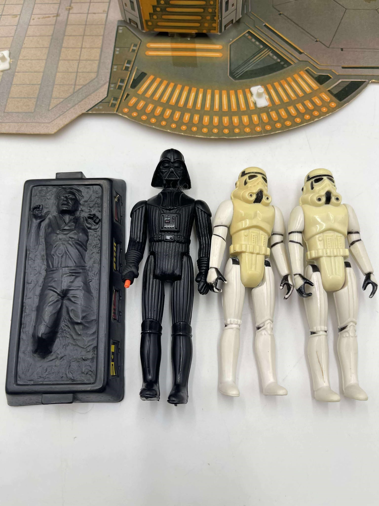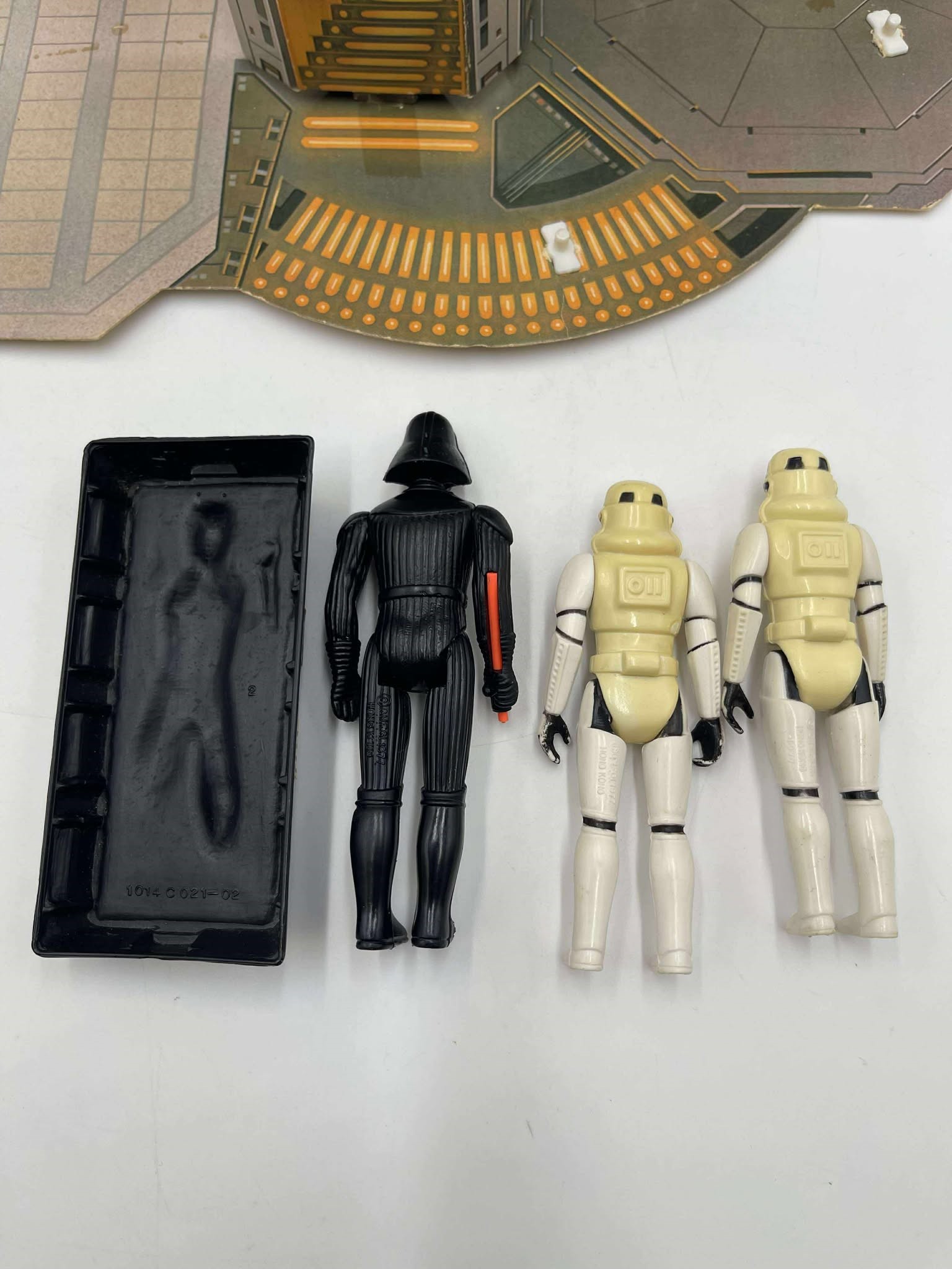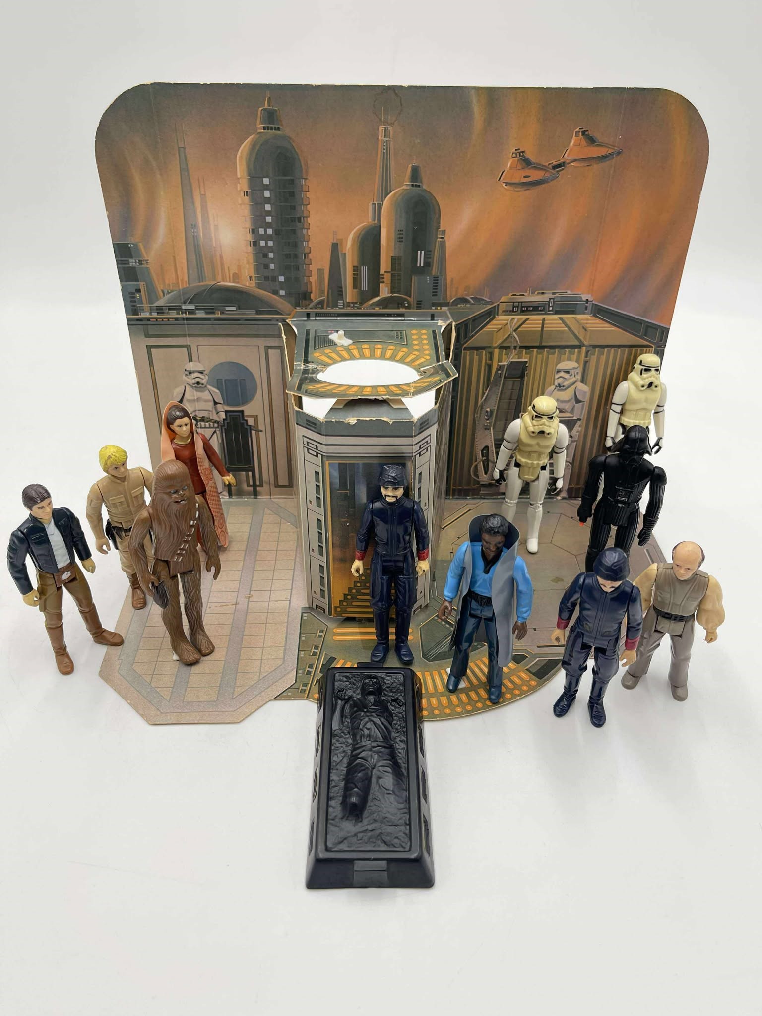 1980 - Kenner - ESB Cloud City Playset (Complete) - This lod also comes with 12 Loose action figures. Han Solo, Chewbacca, Luke Bespin, Leia Bespin, Lando Calrissian, Lobot, 2 Bespin GUards (White), Han Solo In Carbonite, Darth Vader, & 2 Stormtroopers. The top flap is creased and missing a tab. Condition: VG Value Code: C8 ($200-$400)